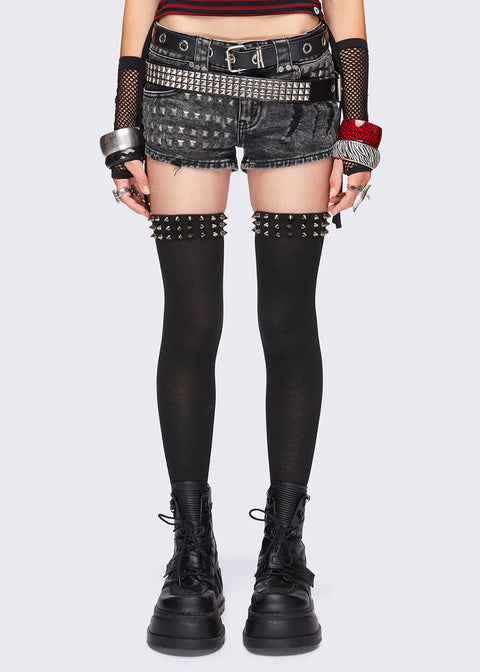 Looking cute maar kom niet te dichtbij: ze is prikkelbaar! De zilverkleurige spikes aan de bovenkant van de over-de-knie-kousen zijn niet alleen veilig, maar ook perfect voor een edgy look. Wie ga jij als eerst prikken?
