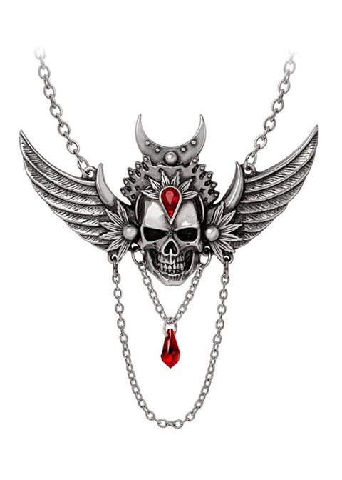 Immortal Ayesha on puhdasta goottilaista loistoa: uhkaava, tyylitelty kallo keskellä, korostettuna syvänpunaisella kristallilla, joka näyttää yhä hehkuvan. Riipuksen alla roikkuu punainen pisara ja ketjunpätkä, joka liikkuu jokaisella askeleella — pieni yksityiskohta, suuri vaikutus.