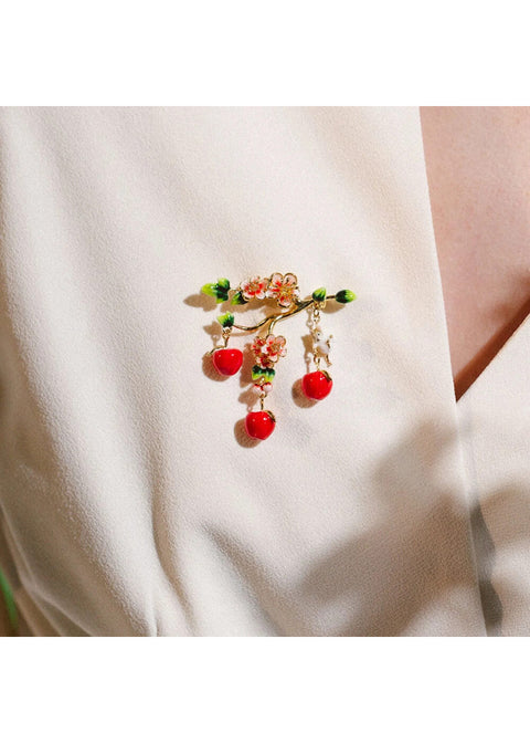 Luontoinspiroitu rintakoru, jossa omenateema ja pieni hiiri kukkakuvioissa — suunniteltu Bill Skinnerin toimesta.