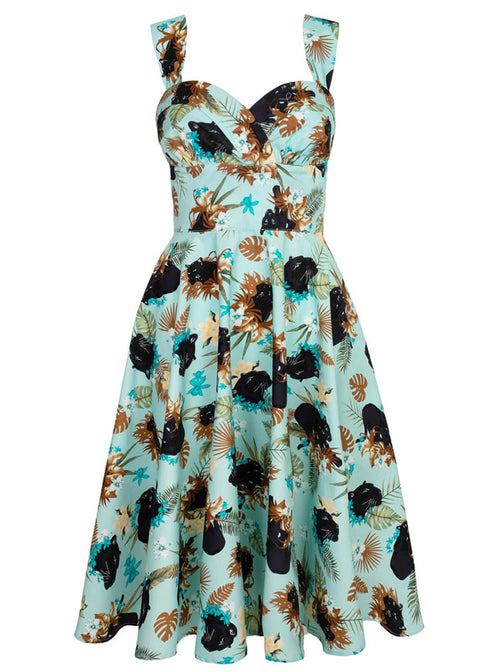 Raikkaalla aqua-värisellä puuvillasekoitteella mustat panterit hiipivät lehtien ja kukkien lomitse — vähän viidakkoa, vähän pin-upia ja ennen kaikkea omaa tyyliään. Leveä helma tanssii jokaisella askeleella; toimitko sinä sen kanssa ronskien saappaiden vai Vavavoom-korkojen kera?