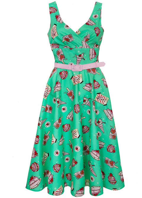 Virkistävän vihreänsinisellä pohjalla jäätelöt, kakunpalat, cupcaket ja mansikat leikkivät keskenään pienine kimalluksineen, aivan kuin olisit juuri astunut amerikkalaiseen diner-ravintolaan. Retrohenkinen malli tarjoaa kauniin V-aukkoa muistuttavan yläosan leveillä olkaimilla ja hulmuavan helman, joka pyörähtää heti ensimmäisestä askeleesta. Vaaleanpunainen vyö viimeistelee kokonaisuuden — tekeekö mielesi jotain makeaa?
